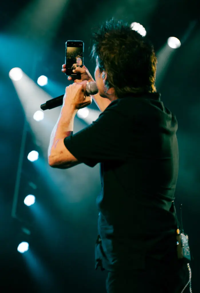 Arriving back to the photo put in time for Train’s set, I was intrigued to see Train’s set that had 3 giant suitcases on stage covered in travel patches. 2 standing up right, and one overturned on its side with a piano on top of it. Train smiled to the crowd and opened with song “Calling All Angels” ending the song with an abundance of streamers falling onto the crowd. During the second song “If It’s Love” people in the crowd started throwing their cell phones up on stage, and Patrick (Train’s vocalist) grabbed them each one by one and took selfies and videos on them before throwing them back into the crowd. Right off the bat, I was amazed at how interactive Train had been with the audience.