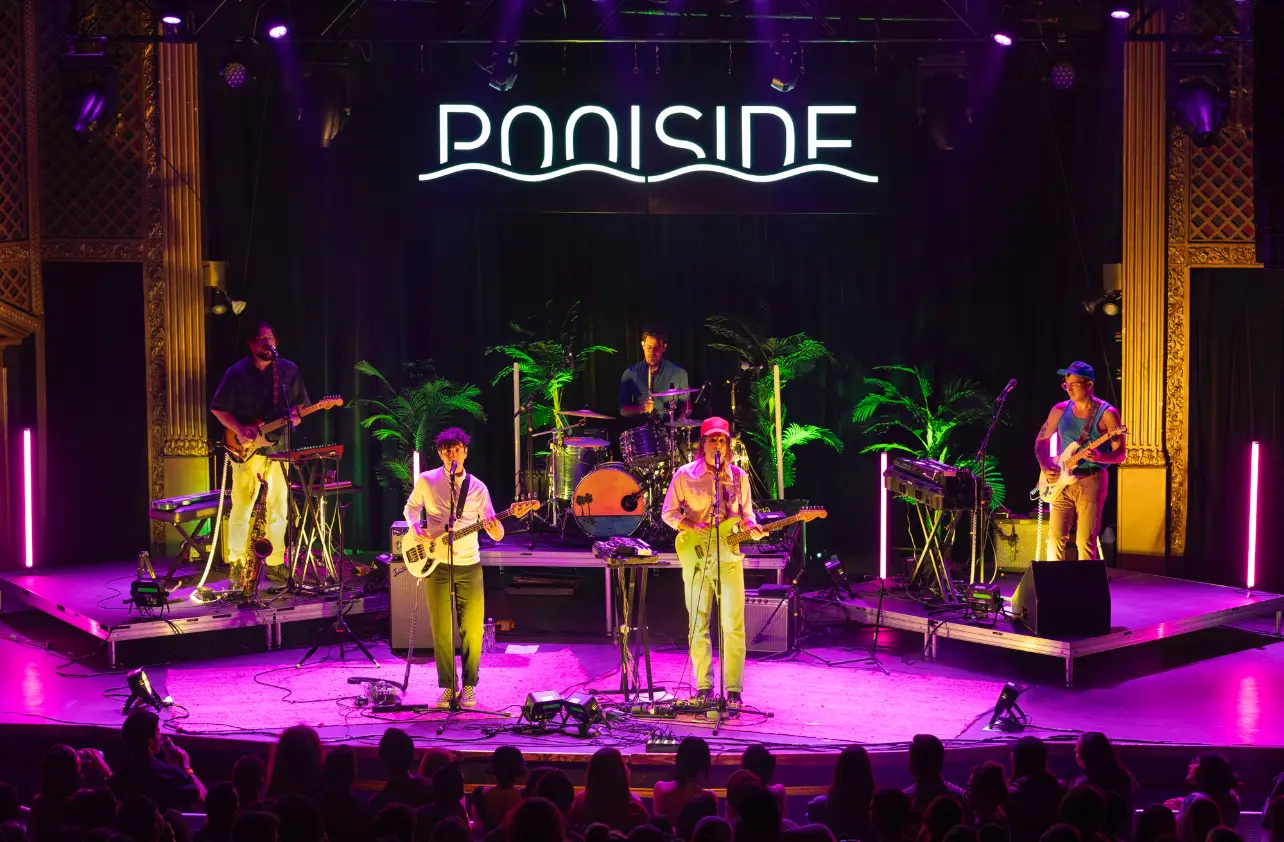Formed in 2011 by Jeffrey Paradise and Fillip Nikolic, Poolside has become known for their unique take on nu-disco, which they call “daytime disco.” The band’s lineup, which currently includes Jeffrey Paradise (lead vocals/guitar), Vito Roccoforte (drums), Mattie Safer (bass/vocals), Casey Butler (saxophone/vocals), and Alton Allen (vocals/guitar), brings together a diverse array of talents to create a sound that is both alternative and timeless.